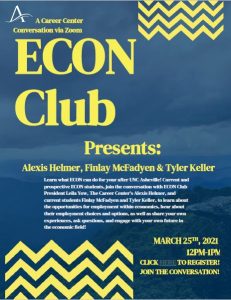 The Career Center partnered with the ECON Club and current economics students to lead a discussion on career options, job searches, and to share their experiences. Attendees were encouraged to ask questions and share their own experiences at the end of the talk. A recording of that event can be found HERE.